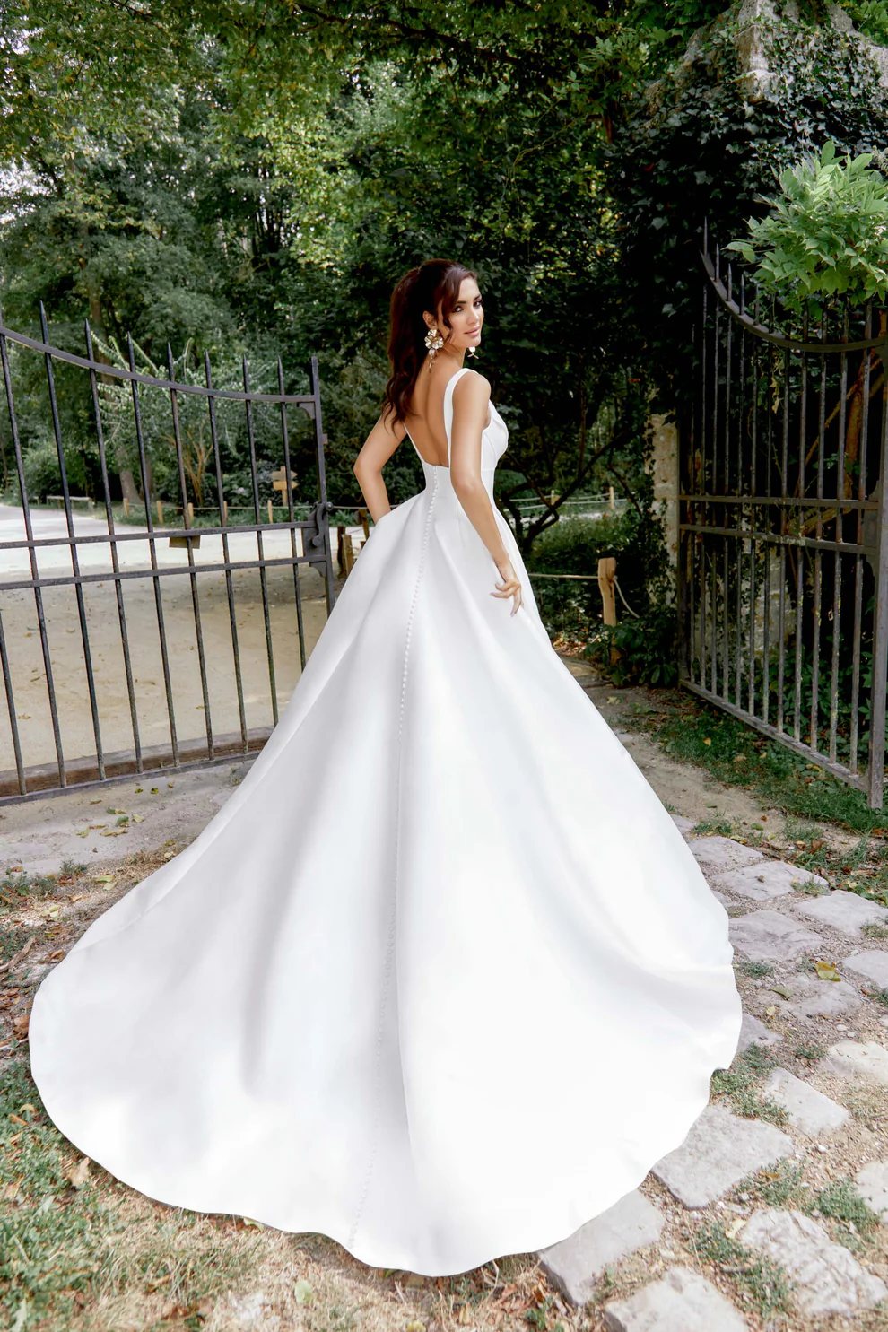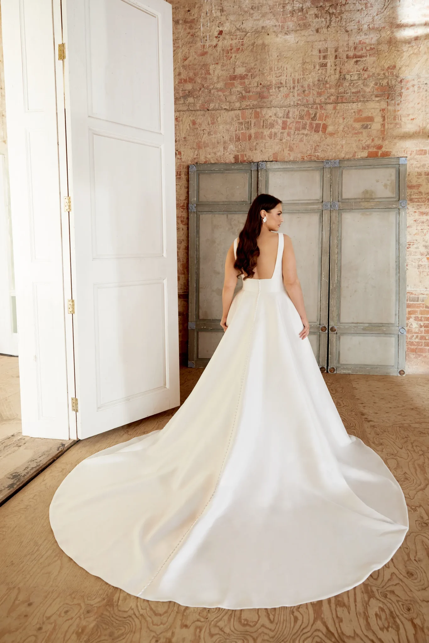 Discover elegance with our Mikado Wedding Gown, featuring a luxurious fabric that exudes sophistication and grace. This gown showcases a beautifully structured bodice with subtle pleating and a flattering A-line silhouette. The clean lines and timeless design make it perfect for the modern bride seeking classic charm. Embrace your special day with this stunning masterpiece.