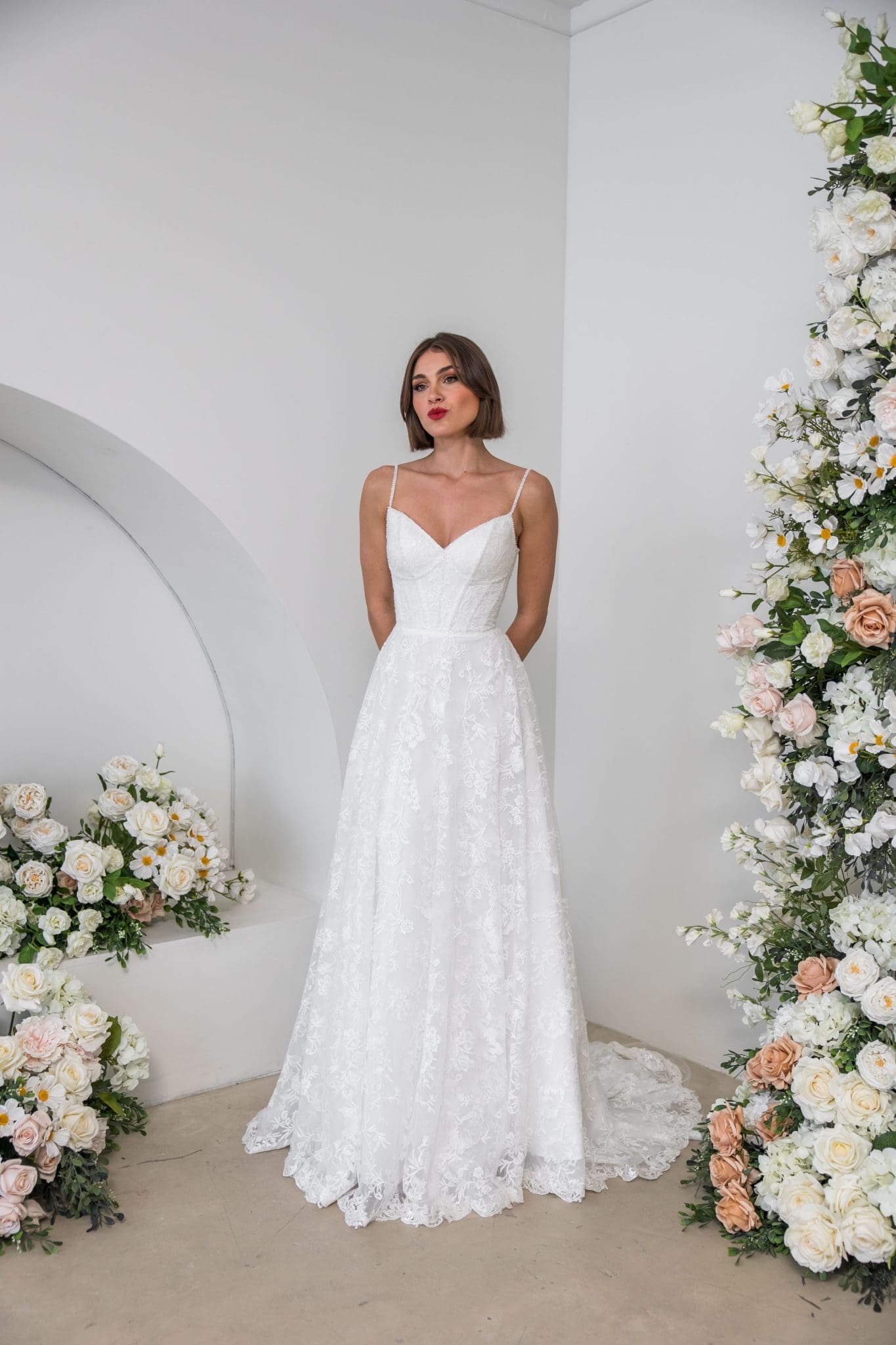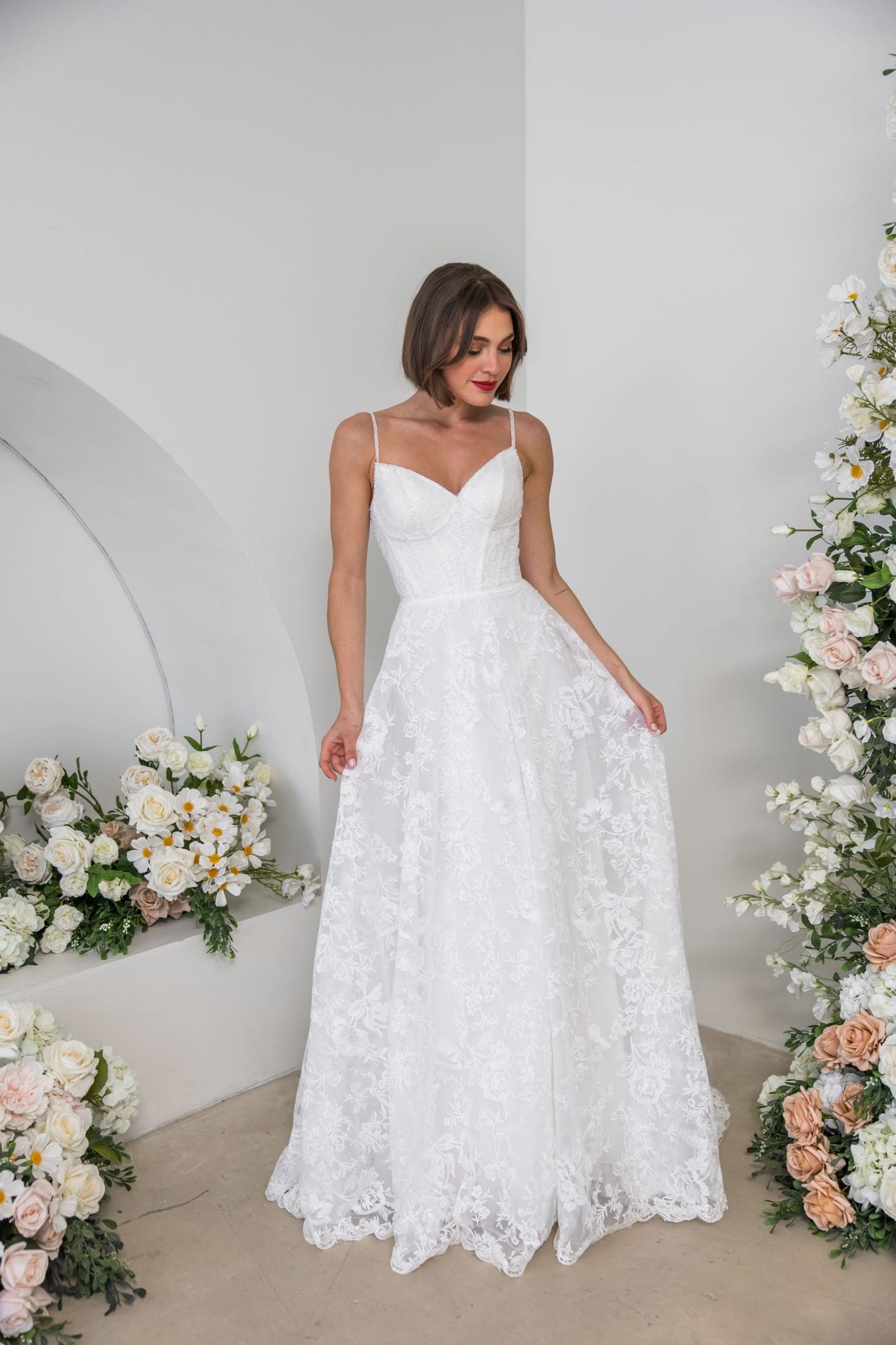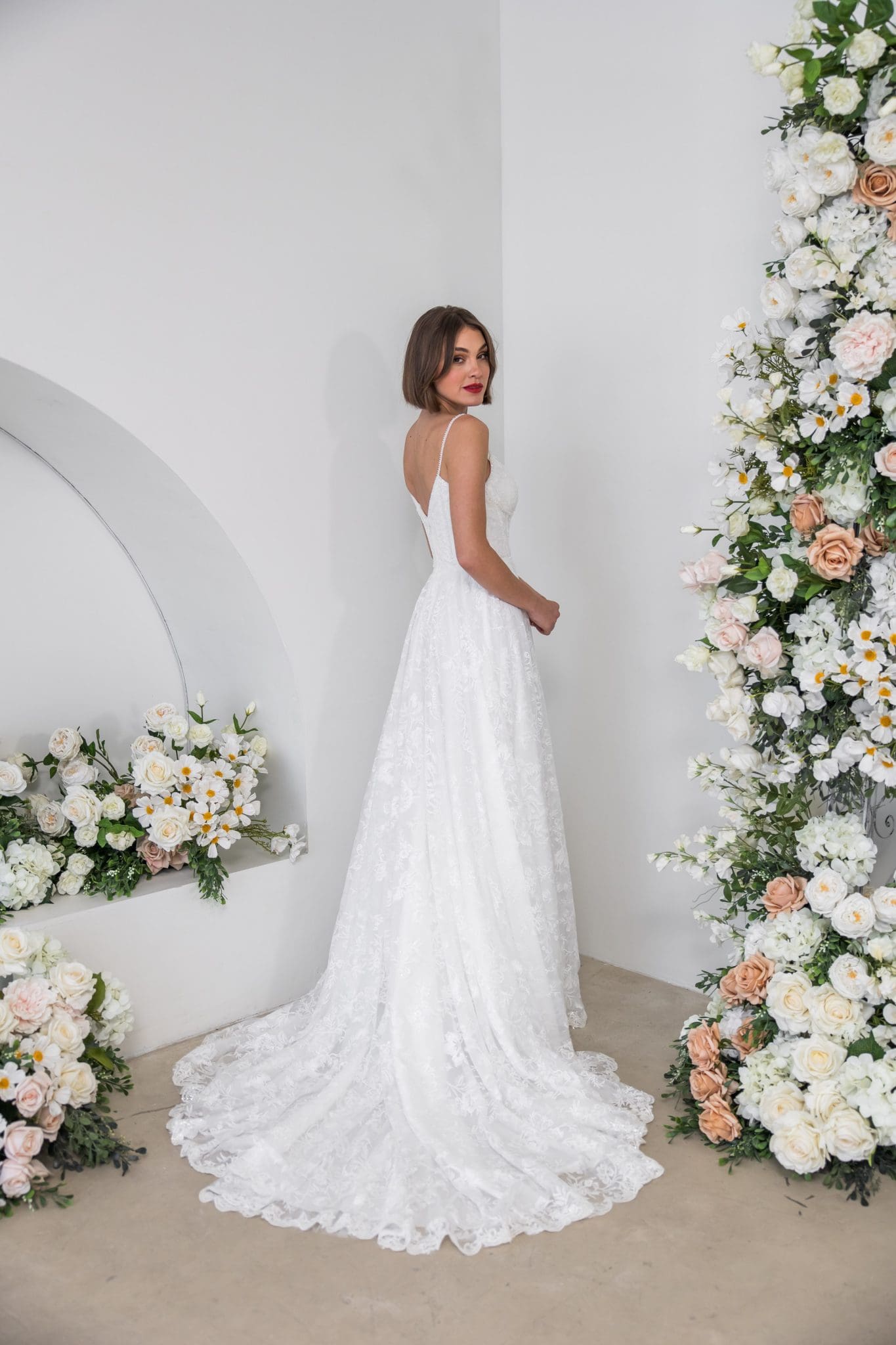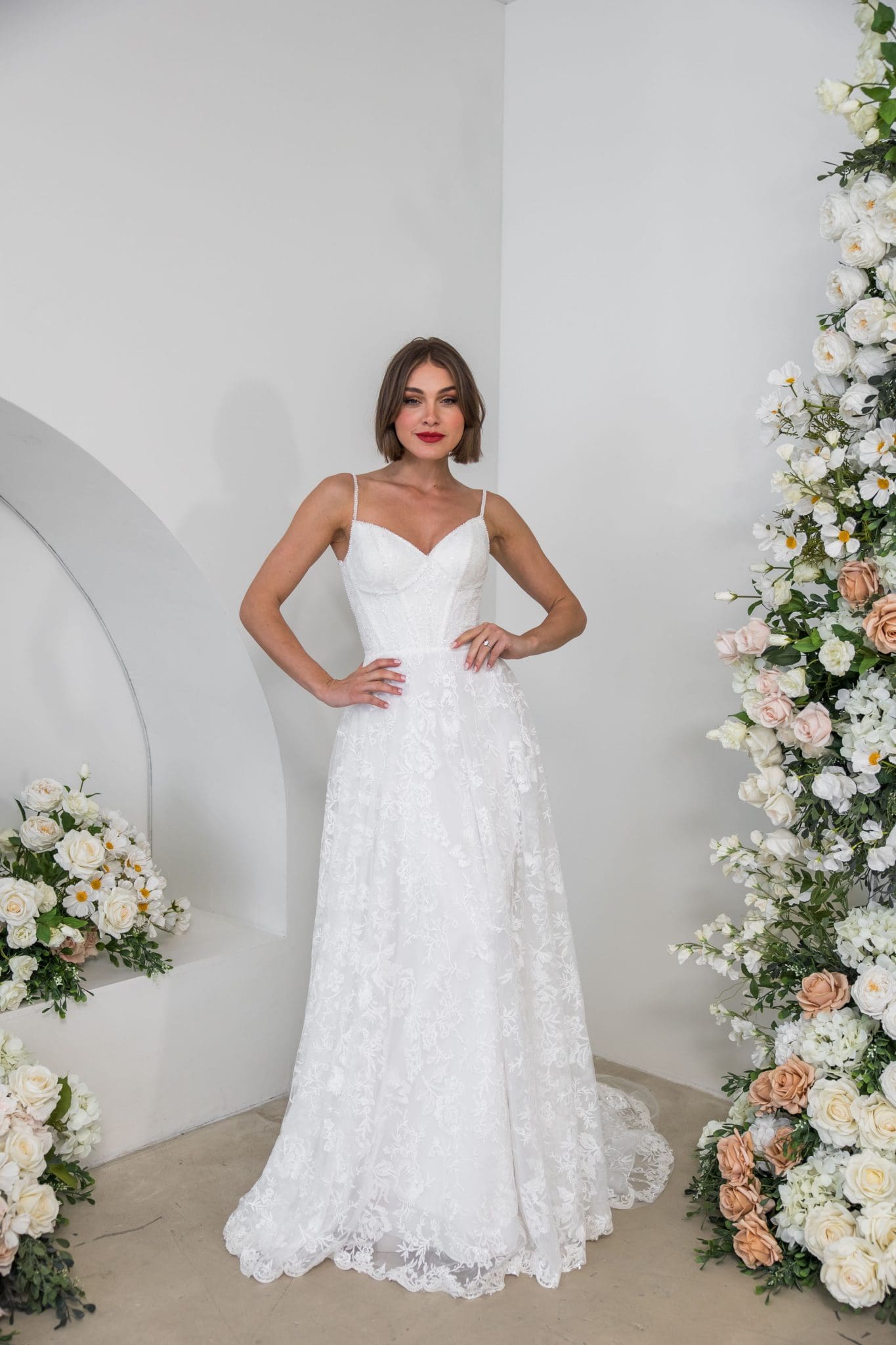 Timeless elegance defines Black Velvet. This wedding gown features a fitted bodice with delicate spaghetti straps, complemented by romantic floral lace that cascades over a flowing A-line skirt. The result is a graceful, ethereal silhouette—perfect for the bride seeking classic beauty with a modern touch.