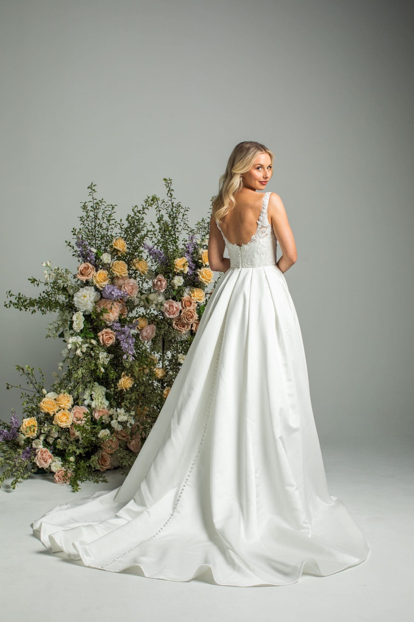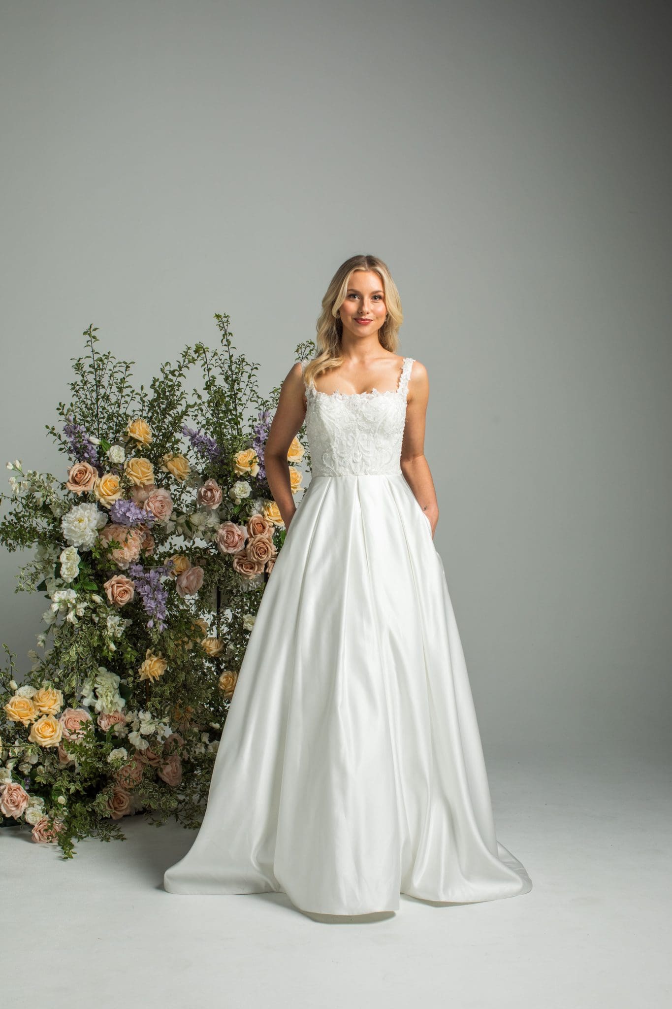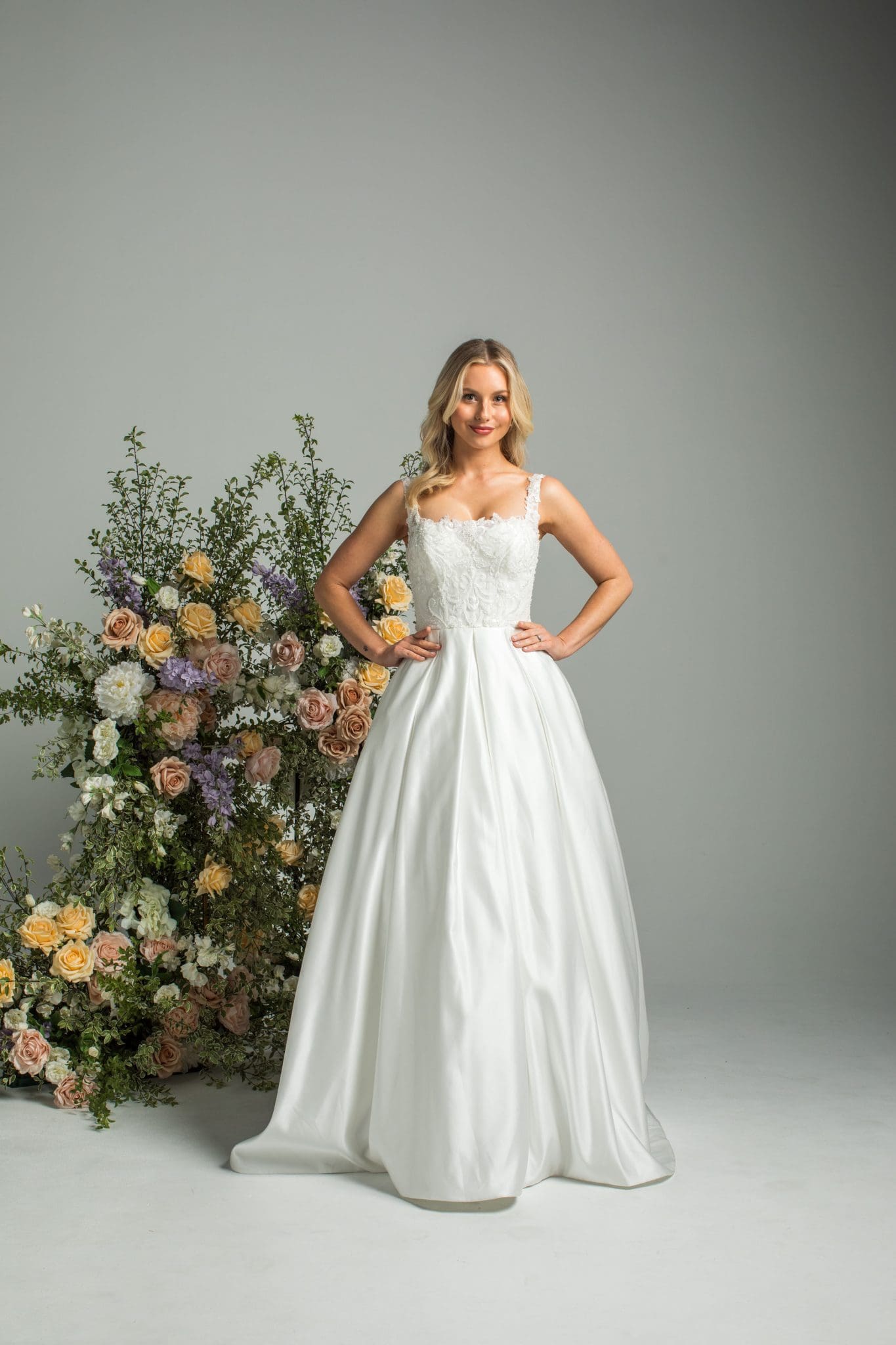 “City of Blinding Lights” is a timeless A-line wedding gown that blends elegant structure with refined detail. Featuring a square neckline and a beautifully beaded lace bodice, the gown flows into a clean satin skirt with classic box pleats.