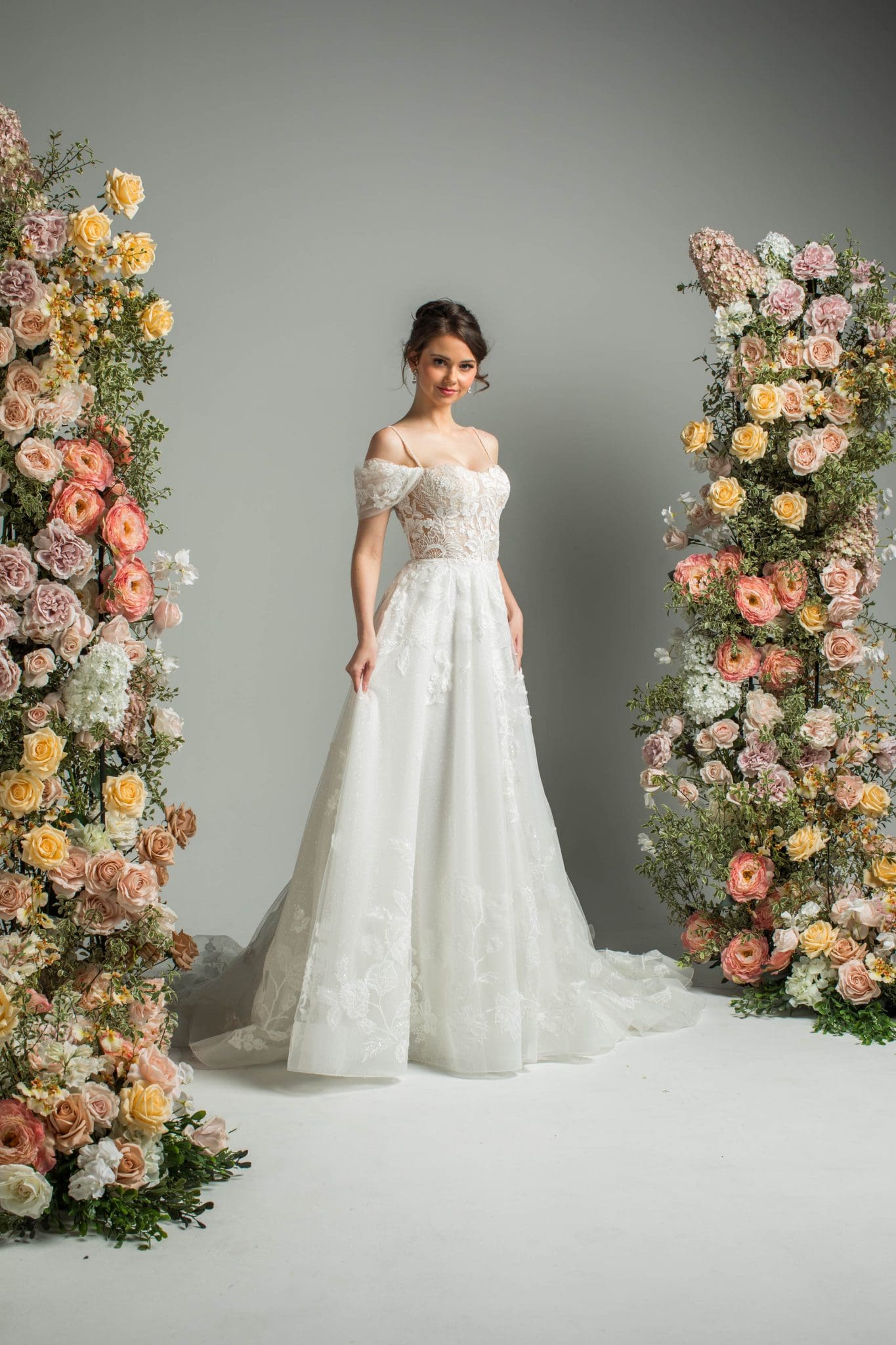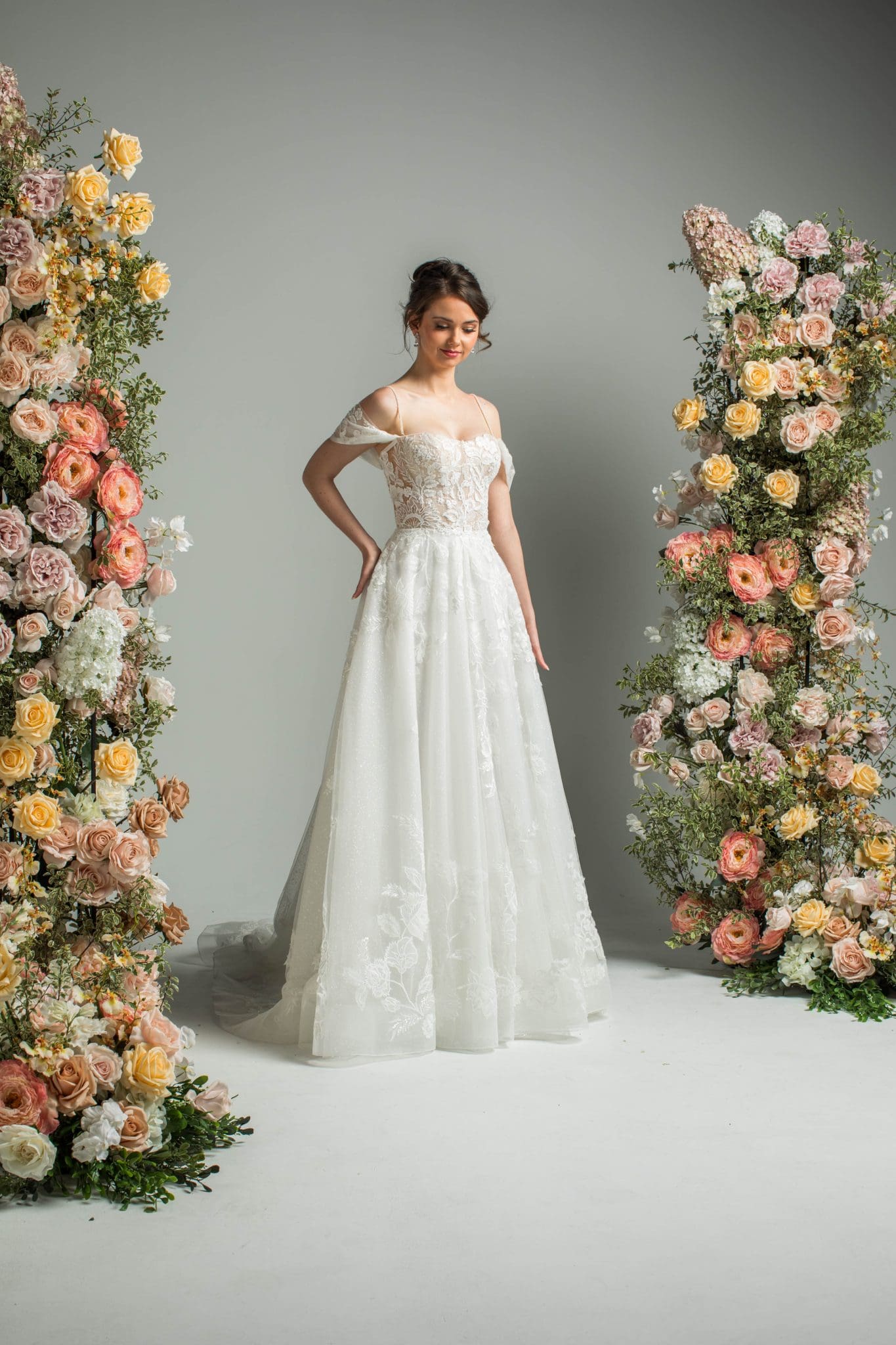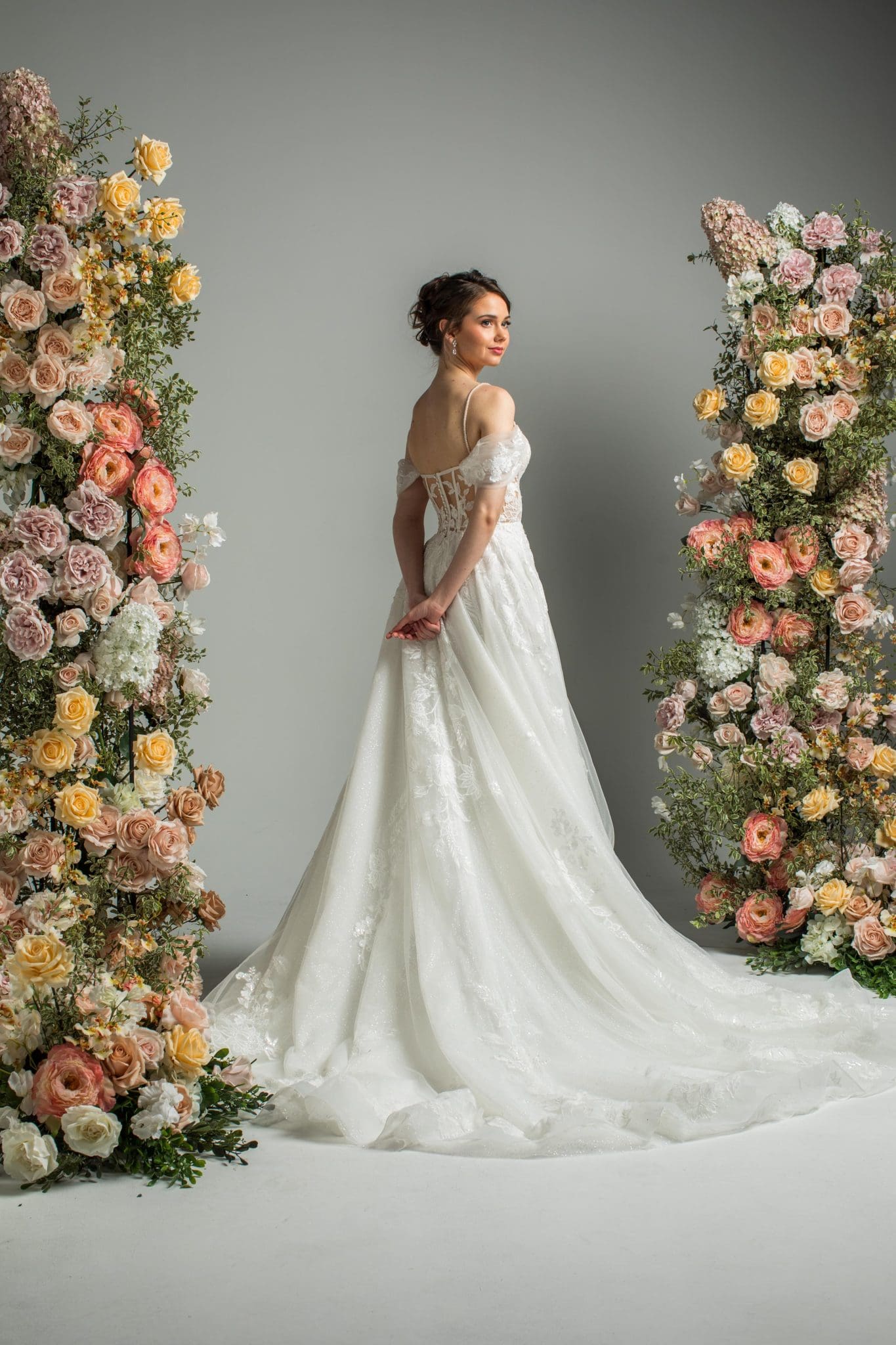 “Hold You Close” is a romantic A-line wedding gown crafted from lace and sparkly tulle. The gown features a soft sweetheart bodice, nude spaghetti straps, and detachable off-the-shoulder sleeves for versatile styling.
