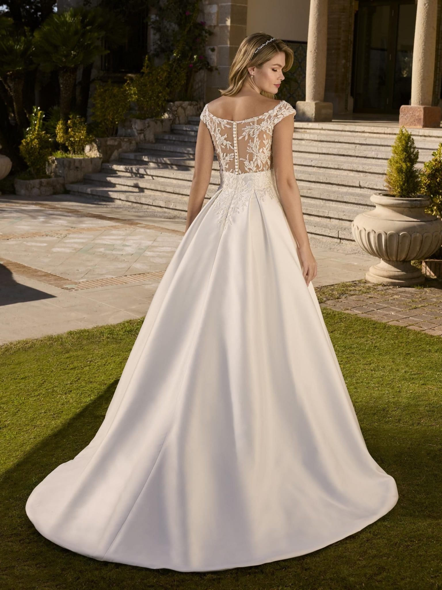 A luxurious princess wedding gown featuring an off-the-shoulder neckline, composed of soft mikado, layered tulle, delicate lace, and exquisite beads. An impeccable choice for a regal and contemporary wedding vision.